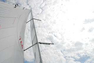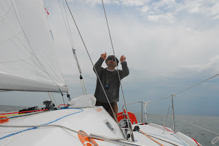 Un manque à virer, une écoute qui file et voilà le solent qui se déchire. Il a fallu démêler, rehisser la voile et enfin virer; nous passions en 20ième place.