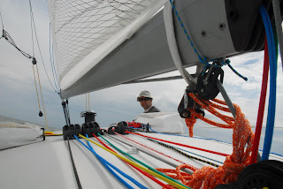 James le Directeur de course nous montrait encore une fois son engagement total et grâce à lui les techniciens locaux se sont démenés pour nous refaire un gréement ( Merci Andy), réparer notre Grand voile déchirée.