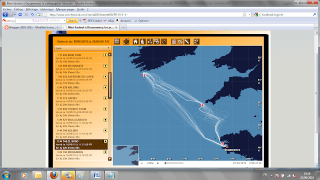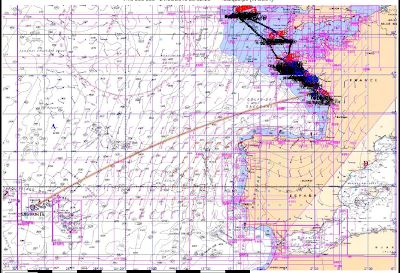 Vous pouvez constater sur cette petite carte la différence du terrain de jeu. En haut, en noir, le tracé de la course du Fastnet. En bas la belle courbe qui relie Les Sables aux Acores.
